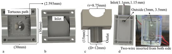 The dimensions of the dripline connection part were 3.4 × 3 × 3 cm (L × W × H, respectively). The thread size was (½ inch * 20) with a length of 0.15 cm, the hole diameter inside the thread is 5 mm, and the drip tube diameter was 0.17 cm. These dimensions were selected to match the female threaded port of the solenoid valve (Figure 2c). This first stage of the flow path also includes a tortuous path to reduce the pressure of the flow (path width is 0.26 cm with +/−0.08 mm, Figure 3a).