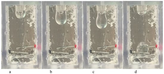 Drop formation and measurement include (a) drop creation, (b) the drop becoming larger, (c) the drop before detachment, and (d) the drop touching the metal leads, closing the circuit, and being counted. The outer diameter of the upper nozzle is 0.35 cm for scale.