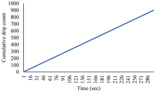 A test of the VRDI prototype was performed at Oregon State University to (1) demonstrate that a drop-counting device is technically feasible and (2) determine the range of variability in water application volumes as a function of pressure. A pressure-regulated flow was provided for conventional, pressure-compensated drip lines (DIG’s Earthline Brown) and the new VRDI design. Two versions of the VRDI design were tested to determine the potential for the nozzle design to affect drop size. The test was done for two inside diameters of 0.11 cm and 0.12 cm (+/−0.08 mm) with two outside diameters of 0.3 cm and 0.35 cm (+/−0.08 mm). All drip irrigation systems were operated for 10 min, 20 min, 30 min, and 60 min. All tests were performed for a range of operating pressures: 14 kPa, 28 kPa, 41 kPa, 55 kPa, 69 kPa, and 83 kPa (Table 2). Note that the minimum working pressure of the commercial system is 69 kPa. One advantage of the VRDI emitter is that it can operate at much lower pressures and save energy; therefore, we included low-pressure values, outside the range of the commercial line to challenge the new design. The pressure was regulated with a pressure regulator (Stettler support company, Salem, OR). This regulator has an error of +/−7 kPa or (1 psi). Water exiting the VRDI units, and the convention drip line were collected in graduated cylinders to measure the total volume of water applied. These were rainfall measurement cylinders, which contain two cylinders: the first one was 31 cm high and 10 cm in diameter, and the second was 25.4 cm high and 3.1 cm in diameter. The smaller cylinder was placed inside the larger one, leaving a 0.6 cm free space to allow water to spill to the large cylinder if the smaller one was full. A time series of the progression of a drop from formation to emission is presented in Figure 4. A summary of all measurements, including the mean and standard deviation for water drops count and water volume emitters (0.3 cm and 0.35 cm) at the different times of operation with different pressures are presented in Table 2. The drip count by the system with time is presented in Figure 5. The system counted cumulative water drops with the time. The water flow or drip count was slightly affected by increasing pressures compared to the commercial drip emitter.