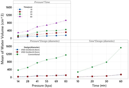 The interaction terms between the independent variables were also investigated. In the case of statistically significant effects, custom post hoc contrasts were performed for multiple comparisons using Tukey’s HSD test []. Figure 6 plots the mean of water volume (cm3) at each level of design, pressure, and time, as well as pairwise comparisons. Regardless of the time, during the testing, the water volume for the VRDI design was lower at all pressure levels when compared to the conventional design. Similarly, when the pressure is held constant, the water volume was lower for the VRDI design when compared to the conventional one for all periods.