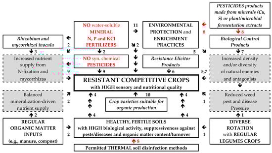 Logical Framework for organic crop-production systems (adapted from Leifert et al. []). Black text in white background describes inputs and practices permitted in organic farming; black text in boxes with grey background surrounded by dotted lines indicates an agronomically desirable effect of permitted inputs and practices or the non-use of agrochemicals; black text in boxes with white background surrounded by solid lines describes agronomic practices permitted and/or recommended in organic farming; red text in white background boxes surrounded by solid black lines describes inputs that are prohibited in organic farming. Black arrows indicate desirable impacts; red arrows indicate undesirable impacts. 1, see also Section 2.1; 2, see also Section 2.2.1 and Section 2.2.2; 3, see also Section 2.2.3; 4, see also Section 2.3.1; 5, see also Section 2.3.2; 6, see also Section 2.3.3; 7, see also Section 2.3.4; 8, see also Section 2.3.5; 9, see also Section 2.3.6; 10, see also Section 2.4.