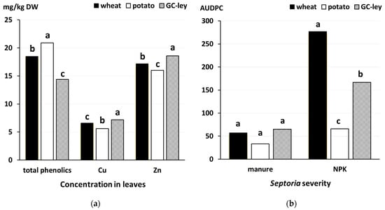 Effect of (a) preceding crops (wheat, potato, grass-clover [GC] leys) on total phenolic (p = 0.001), Cu (p = 0.002) and Zn (p = 0.013) concentrations in wheat leaves and (b) fertilization regime (manure versus mineral NPK fertilizer applied at the same total N-input rate of 170 kg N hectare) and preceding crops on Septoria severity (p < 0.001 for interaction) data from []. Means for the same composition parameter or fertilizer type labelled with the same letter are not significantly different (Tukey’s honest significant difference test, p < 0.05). AUDPC, area under the disease progress curve days x % severity.