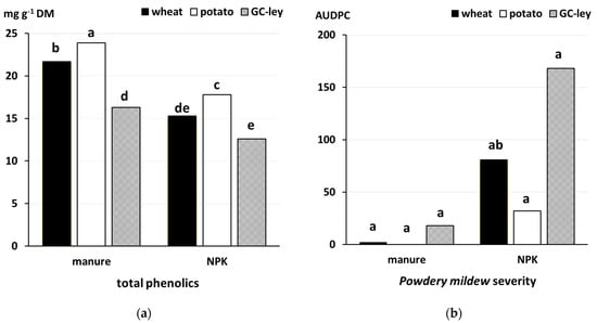 Effect of fertilization regime (F; manure versus mineral NPK fertilizer applied at the same total N-input rate of 170 kg N hectare) and preceding crop (PC) on (a) total phenolic concentrations (p = 0.089 for F×PC interaction), and (b) powdery mildew severity (p < 0.001 for FxPC interaction) in wheat leaves data from []. Means labelled with the same letter are not significantly different (Tukey’s honest significant difference test, p < 0.05). AUDPC, area under the disease progress curve days x % severity; DM, dry matter.