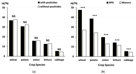 Effect of contrasting (a) crop protection (with and without the use of synthetic chemical pesticides) and (b) fertilization regimes (mineral NPK versus manure applied at the same total N-input rate of 170 kg N hectare) used in organic and conventional farming on cadmium concentrations in wheat grain, potato tubers, onions, cabbage heads and lettuce leaves Data from [,]. Bars represent the main effect means of data from four (potato, onion, lettuce, cabbage) or five (wheat) growing seasons. ***, significant difference (p < 0.001); NS, not significant.