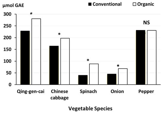 Effect of crop management (organic vs conventional) on antioxidant activity/capacity in vegetables. GAE, gallic acid equivalents data from []. The organic (but not the conventional) crop management included the incorporation of 500 kg chitosan/ha before planting, and crops being sprayed regularly with a 0.01% chitosan solution during the growing season. *, significant difference (p < 0.05); NS, not significant.