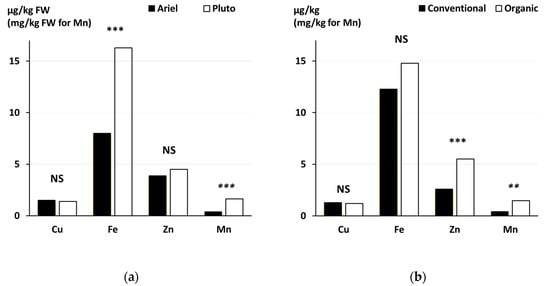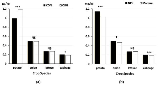 Effect of contrasting (a) crop protection (CON, conventional crop protection based on synthetic chemical herbicides, fungicides and insecticides; ORG, organic crop protection based on mechanical weed control and hand weeding and the use of Cu-fungicides in potato only) and (b) fertilization regime (mineral NPK versus manure applied at the same total N-input rate of 170 kg N hectare) used in organic and conventional farming on copper concentrations in potato tubers, onions, cabbage heads and lettuce leaves, Data from []. Bars represent main effect means of data from four growing seasons. ***, significant difference (p < 0.001); *, significant difference (p < 0.05); T, trend (0.01 < p < 0.05); NS, not significant.
