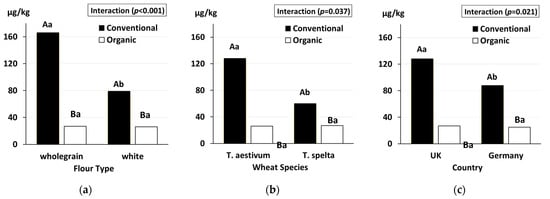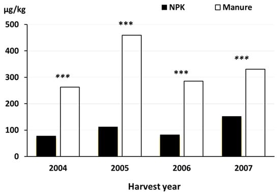 In contrast, concentrations of toxic glycoalkaloids in potato tubers were significantly lower when manure, instead of mineral NPK, was used as fertilizer in the NFSC trials (Table 1). However, the effects of mineral NPK versus organic fertilizer use on non-resistance related phytochemicals are less consistent than those observed for phenolics. For example, in the NFSC trials, the use of manure instead of mineral NPK resulted in slightly (~5–10%), but significantly, lower concentrations of tocopherol and tocotrienol in wheat grain [].