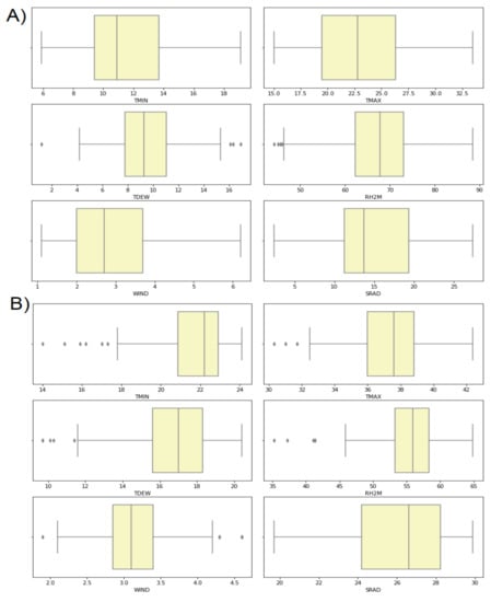 Boxplots of weather data over wheat growing season (A) and summer maize growing season (B). Parameters include minimum temperature (TMIN), maximum temperature, °C (TMAX), dew point temperature (TDEW), relative humidity, % (RH2M), wind speed, m/s (WIND), and solar radiation, MJ/m2/day (SRAD).