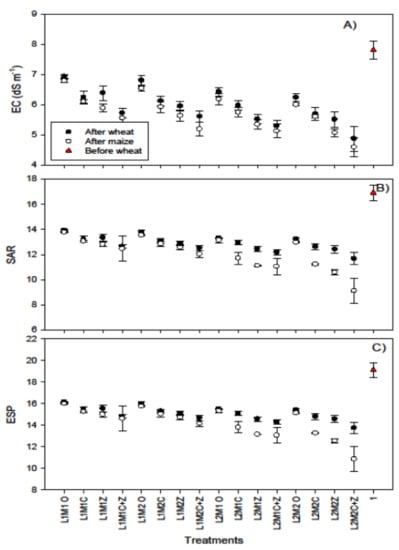 Soil EC, SAR and ESP following wheat (closed scatter) and maize (open scatter) subjected to different treatments of irrigation with various leaching requirements as 5% (L1) and 10% (L2), planting methods raised bed (M1) and conventional (M2), as well as conditioners application such as control, compost (C), zeolite (Z) and mixture of compost and zeolite (C + Z) compared to initial values (red triangle). The symbols are means and error bars are standard deviations.