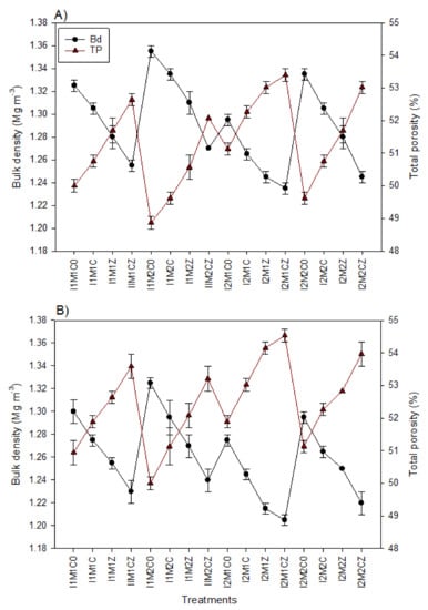 Soil bulk density and total porosity following wheat (A) and maize (B) subjected to different treatments of irrigation with various leaching requirements as 5% (I1) and 10% (I2), planting methods raised bed (M1) and conventional (M2), as well as conditioners application such as control, compost (C), zeolite (z) and mixture of compost and zeolite (C + Z). The symbols are means and error bars are standard deviations. The initial values of bulk density and total porosity before wheat crop were 1.37 Mg m−3 and 48.3%, respectively.