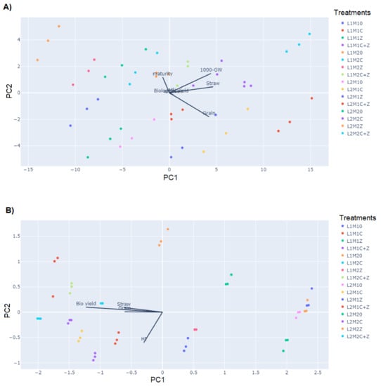 Principal component analysis (PCA) to better understand the variability of wheat (A) and maize (B) yield with their components (loadings), and corresponding treatments (scores). The loadings of wheat include wheat grain yield, straw yield, biological yield, grain weight, harvest index (HI), anthesis date and maturity date. Meanwhile, the loadings of maize consisted of grain yield, straw yield, biological yield, and harvest index. The treatments (scores) included combination of irrigation with different leaching fractions as 5% (L1) and 10% (L2), planting methods as raised bed (M1) and conventional (M2), as well as different soil amendments as control (C0), compost (C), zeolite (Z), and mixture of compost and zeolite (C + Z).