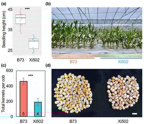 FAW resistant maize inbred line Xi502 and a susceptible inbred line B73 were grown in a greenhouse and in a field to observe the comparative phenotypes [28]. We noticed that Xi502 seedlings and mature plants were significantly shorter than B73 plants sowed at the same time (Figure 1a,b). Additionally, Xi502 plants produced fewer seeds per cob when only one cob per plant was hand-pollinated and retained for harvest (Figure 1c,d).