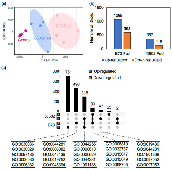 As a maize-specialized insect herbivore, FAW has evolved various counter-defense mechanisms to facilitate its success on its preferred host plant. To study the potential physiological impact of feeding on Xi502 versus B73, we collected FAW larvae after 24 h of feeding on these two maize cultivars and an artificial diet (as the shared control group). The principal component analysis results of the RNAseq data demonstrated that transcriptomes of B73-fed larvae were more different from the control group than their siblings fed with Xi502 tissues (Figure 2a; Table S1). Consistently, 1069 induced and 593 suppressed DEGs were found between B73-fed FAW larvae and the control group, whereas the larvae feeding on Xi502 had only 367 up-regulated and 118 down-regulated DEGs compared to the same control group (Figure 2b). There was a clear overlap in the two sets of DEGs (B73-fed larvae versus control, and Xi502-fed larvae versus control), and all but two expression changes were in the same direction (Figure 2c). Additionally, more than 1200 genes were only significantly differentially expressed in B73-fed larvae, while those fed with Xi502 tissues had less than 100 of such group-specific DEGs.