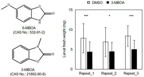 3-Methyl-2-benzoxazolinone feeding suppresses FAW growth. Three independent repeats of fresh weight measurements of FAW neonates after feeding on an artificial diet supplemented with DMSO only or 3-methyl-2-benzoxazolinone (3-MBOA) for seven days (n = 24). * p < 0.05; *** p < 0.001; Student’s t-test. Error bars = standard errors.