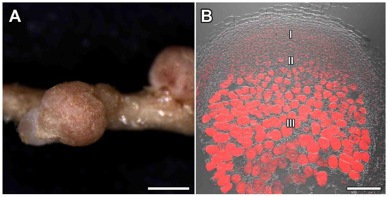 Nodulation of Glycyrrhiza uralensis Fisch. ex DC. (A) mature nodules; (B) histological organization of Glycyrrhiza uralensis nodules. I—meristem, II—zone of infection, III—zone of nitrogen fixation. Bar (A) = 1 mm, (B) = 500 µm.