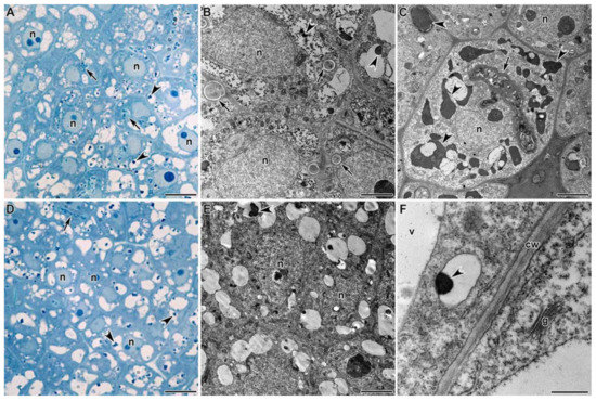 In the infection zone of G. uralensis nodules, numerous infection threads (Figure 3A–E) and infection droplets (Figure 3A–D,F) were observed. Infection threads and droplets had structures characteristic of those in other legumes; however, the wall of infection threads was noticeably different from the cell wall in density and fibrillarity (Figure 3E). The bacteria being released from the infection droplets were each surrounded by a separate membrane (Figure 3F). In a thin layer of cytoplasm around the merging vacuoles, juvenile bacteroids were distinguished, which did not differ from bacteria in the size and density of their matrix (Figure 3C,F).