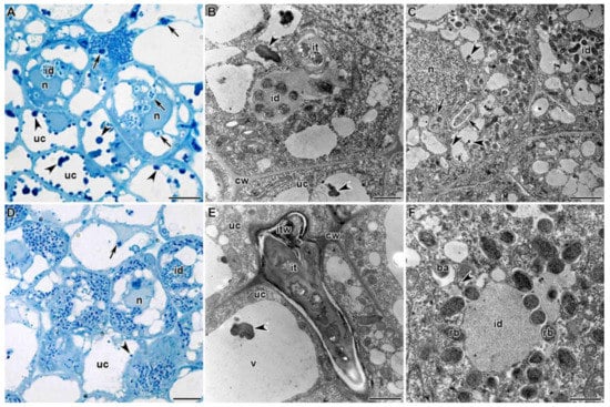 Histological and ultrastructural organization of the infection zone in Glycyrrhiza uralensis Fisch. ex DC. nodules infected with Mesorhizobium sp. strains RCAM3115 (A–C) and RCAM3120 (D–F). uc—uninfected cell, n—nucleus, v—vacuole, cw—cell wall, it—infection thread, id—infection droplet, itw—infection thread wall, rb—releasing bacteria, ba—bacteroid. Arrows indicate infection threads, arrowheads indicate inclusions in vacuoles. Bar (A,D) = 5 µm, (C) = 2 µm, (B,E,F) = 1 µm.
