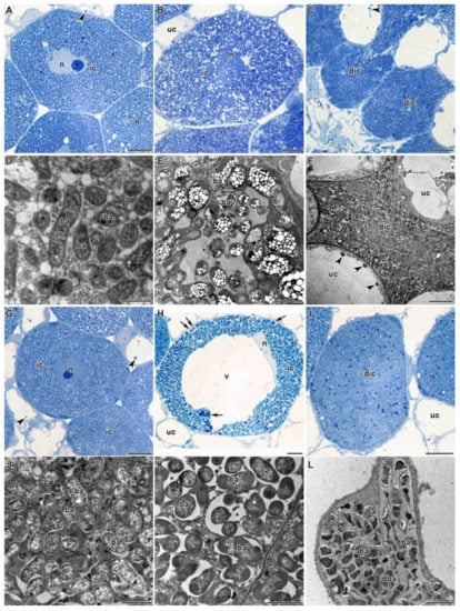 Histological and ultrastructural organization of the nitrogen fixation zone in Glycyrrhiza uralensis Fisch. ex DC. nodules infected with Mesorhizobium sp. strains RCAM3115 (A–F) and RCAM3120 (G–L): (A,G) young infected cells from the nitrogen fixation zone; (B,H) mature infected cells; (C,F,I,L) senescent infected cells; (D,J) symbiosomes with juvenile bacteroids; (E,K) symbiosomes with mature bacteroids. ic—infected cell, uc—uninfected cell, dic—degenerated infected cell, n—nucleus, v—vacuole, ba—bacteroid, dba—degenerated bacteroid, *—symbiosome with several bacteroids (‘multiple’ symbiosomes), arrows indicate multiple symbiosomes, arrowheads indicate inclusions in vacuoles. Bar (A–C,G–I) = 5 µm, (F,L) = 2 µm, (D,E,J,K) = 1 µm.