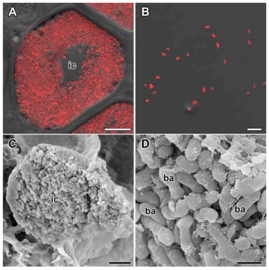 Infected cells and bacteroids in nodules of Glycyrrhiza uralensis Fisch. ex DC. (A,C) Symbiosome arrangement in infected cells of the nitrogen fixation zone; (B) bacteroid morphology based on laser scanning confocal microscopy; (D) bacteroid morphology based on scanning electron microscopy. (A,B) Merged images of differential interference contrast and red channel (DNA staining with propidium iodide [nuclei and bacteria]). ic—infected cell, ba—bacteroid. Bar (A–C) = 5 µm, (D) = 1 µm.