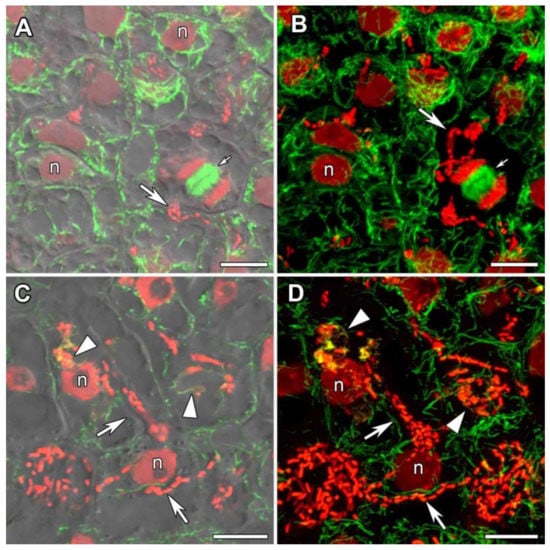 Microtubular organization in meristematic cells and in cells from the infection zone in nodules of Glycyrrhiza uralensis Fisch. ex DC. (A,B) Meristematic cells. (C,D) Cells from the infection zone. Confocal laser scanning microscopy of 35 µm longitudinal vibratome sections. Immunolocalization of tubulin (microtubules), green channel; DNA staining with propidium iodide (nuclei and bacteria), red channel; immunolocalization of MAC265 (infection droplets), yellow channel. (A) Merged images of a single optical section of differential interference contrast and green and red channels. (B) Maximum intensity projections of 25 optical sections in green and red channels. (C) Merged images of a single optical section of differential interference contrast and green, red and yellow channels. (D) Maximum intensity projections of 40 optical sections in green, red and yellow channels. n—nucleus. Triangles indicate infection droplets, large arrows indicate infection threads, small arrows indicate mitotic figures. Bars = 10 µm.