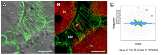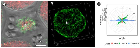 Organization and quantitative analysis of cortical microtubules in uninfected cells in nodules of Glycyrrhiza uralensis Fisch. ex DC. (A,B) Uninfected cells. Confocal laser scanning microscopy of 35 µm longitudinal vibratome sections. Immunolocalization of tubulin (microtubules), green channel; DNA staining with propidium iodide (nuclei and bacteria), red channel. (A) Merged images of a single optical section of differential interference contrast and maximum intensity projection of optical sections in the green channel. (B) Maximum intensity projections of 45 optical sections in the green and red channels. (C) Quantitative analysis of the organization of cortical microtubules in uninfected cells. Classes of microtubules: green—oblique, red—axial, blue—transverse. n—nucleus, ic—infected cell, uic—uninfected cell. Bars = 10 µm.