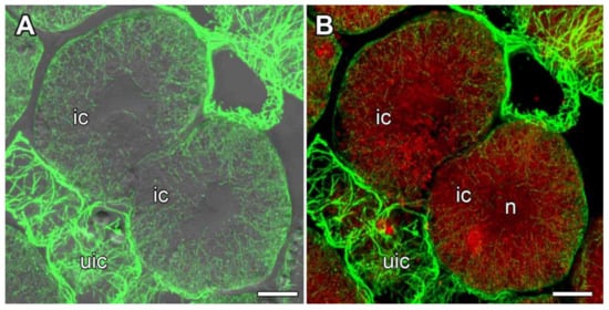 Organization of endoplasmic microtubules in infected cells in the nitrogen fixation zone in nodules of Glycyrrhiza uralensis Fisch. ex DC. Confocal laser scanning microscopy of 35 µm longitudinal vibratome sections. Immunolocalization of tubulin (microtubules), green channel; DNA staining with propidium iodide (nuclei and bacteria), red channel. (A) Merged images of a single optical section of differential interference contrast and maximum intensity projection of optical sections in the green channel. (B) Maximum intensity projections of 50 optical sections in the green and red channels. n—nucleus, ic—infected cell, uic—uninfected cell. Bars, 10 µm.