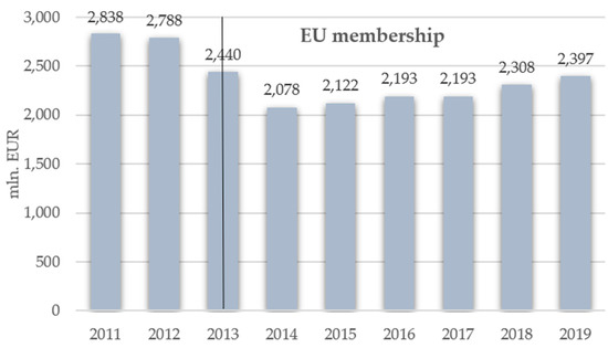 The total output of the agricultural sector has grown since accession (Figure 1), mainly as a result of growth in the volume of crop production, while livestock production has stagnated or recorded negative results, depending on the observed sector. There have been particularly strong negative production trends found in the main livestock sectors, especially in the beef, dairy and pig sectors [34,36,37,38,39].
