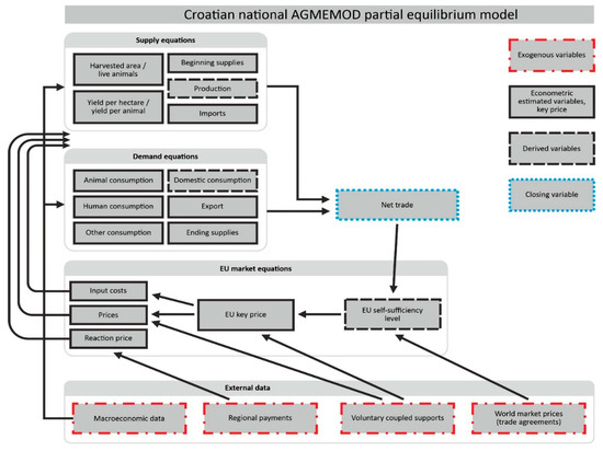 The AGMEMOD (Agricultural Member State Modelling) is an econometric, dynamic, multi-product and multi-country partial equilibrium model. It is commonly used to produce medium-term simulations, i.e., market outlooks for key agricultural commodity markets and policy impact assessments for EU member states and other countries [43]. The AGMEMOD partnership uses a bottom-up approach, according to which an individual country-level model (Figure 2) is built as a system of agricultural commodity market sub-models with country-specific characteristics to be subsequently combined in a composite EU 27 AGMEMOD model [44,45].