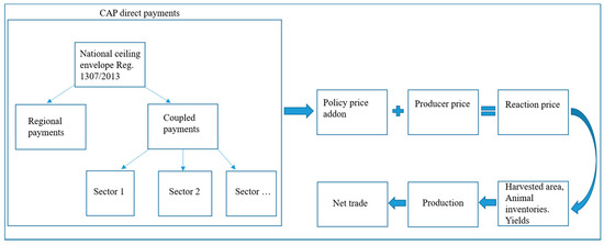 The AGMEMOD modelling approach adopted and used in this research takes into account the different effects of coupled and decoupled direct payments as well as additional environmental constraints included in the description of policy instruments [50]. A policy-harmonised approach within AGMEMOD (Figure 3) enables the recalculation of direct and coupled payments to form a policy price add-on to specific producer prices, thus creating a reaction price and gross margins. Changes in the levels of reaction prices and expected gross margins reflect the impacts of policy change (within the instruments and measures of the CAP in combination with the market price) on the production structure of the observed market. The decoupled and coupled payments’ effects on the specific producer price are determined via multiplier coefficients that represent the share of a particular payment in reaction prices or expected gross margins. In different scenarios, the regional Single Area Payments (SAP) multipliers are set differently with the intention to simulate the possible effects of post-2022 changes to CAP.