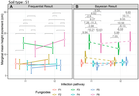 In this study, we conducted an experiment on a total of 554 pepper trees to investigate the effects of fungicides on pepper growth and mortality caused by the foot rot pathogen. By investigating 15 candidate models, the results reveal the advantages and disadvantages of frequentist and Bayesian approaches within the GLM framework. The results also emphasize the effectiveness of fungicide usage against foot rot disease. However, plant growth rates are negatively affected by fungicide treatments depending on the combination of soil type and infection pathway.