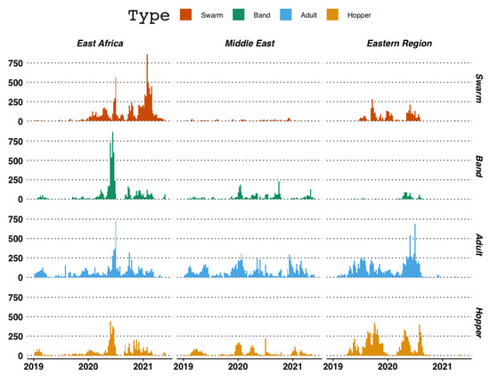 The compiled dataset comprised more than 75,000 desert locust records with 42.5% reported in East Africa, 23.3% reported in the Middle East, and 34.2% reported in Eastern Region (Figure 1). Desert locusts can be either in solitarious (hoppers and adults) or gregarious (bands of hoppers and swarms) phases. In addition, remnant locusts from control operations against hopper bands and swarms were sometimes reported as gregarious hopper and adult individuals or groups. This is not unusual during upsurges. In terms of the types of desert locust classified within the reports, 19.7% were swarms, 14.3% were bands, 39.4% were solitarious adults and 26.6% were solitarious hoppers. There was a high degree of temporal heterogeneity in the numbers of reports. The highest weekly number of swarm reports (855) was reported in East Africa on the week commencing the 26 January 2021, the highest number of band reports (802) was also reported in East Africa on the week commencing the 9 June 2020. This coincides with the breeding periods.