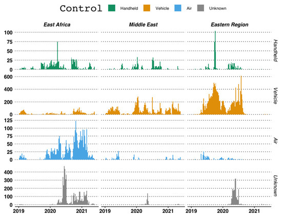 The number of control operations performed in 2019–2021 reflects the enormous scale of the desert locust upsurge and deployment of resources to manage it (Figure 2). Overall, more than 39,000 control operations were conducted with 28.7% reported in East Africa, 23.8% reported in the Middle East and 47.5% reported in the Eastern Region. These consisted of 66.9% vehicle based control, 8.5% air based control and 4.8% handheld based control. About 19.8% of control reports were classified as “Unknown”. This is likely to be control by teams using digital tools that report only basic information, e.g., control = Yes/No without indicating control method.
