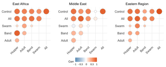 Correlation matrices between the weekly number of control operations and desert locust reports. Colour intensity and the size of the circle are proportional to the correlation coefficients. Data from [24] (Locust Hub).