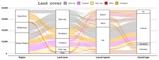 Relationship between control type, locust reports and land cover in the three regions. Y axis corresponds to the number of reported control operations. The most frequent land cover types are given by bare/sparse vegetation (Bare veg.), cropland, herbaceous vegetation (Herb. veg.) and shrubland. Locust reports refer to the gregarious categories ‘Swarm’ and ‘Band’ that were matched to reports of control (i.e., reports within a 1 km radius and up to two days before the control operation in the Locust Hub dataset [24]. The ‘NA’ (‘Not Assessed’) category refers to control operations that could not be matched to the gregarious classes.