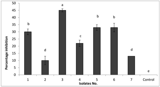 The seven bacterial isolates from tomato plant rhizosphere tested for their antagonistic effect against FKAU1 in vitro indicate that each was able to inhibit the growth of FKAU1 compared to the control at different degrees (7–45%) (Figure 1). Bacterial isolate No. 3 showed the highest inhibition percentage of FKAU1 growth, around 45%. Bacterial isolates No. 1, 5, and 6 showed equally moderate inhibition of growth. Isolate No. 3 was selected for further characterization and chosen as a potential bio-agent against FKAU1.