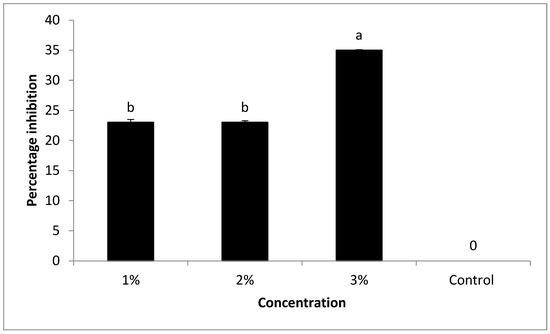 The growth of FKAU1 was suppressed at all tested concentrations (1, 2, and 3%) compared with untreated controls (Figure 2), with 3% showing the greatest reduction at 35%.