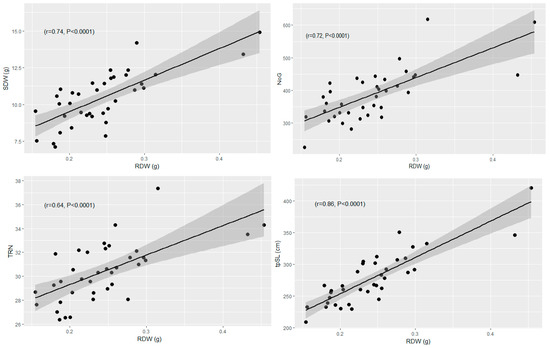 Root dry weight (RDW) relationship with shoot dry weight (SDW), number of gaps in the root area (NoG), total root number (TRN), total projected structure length (tpSL) recorded in the shovelomics experiment. The grey area is the 95% confidence interval of the regression line.
