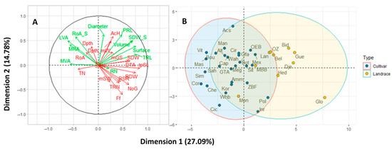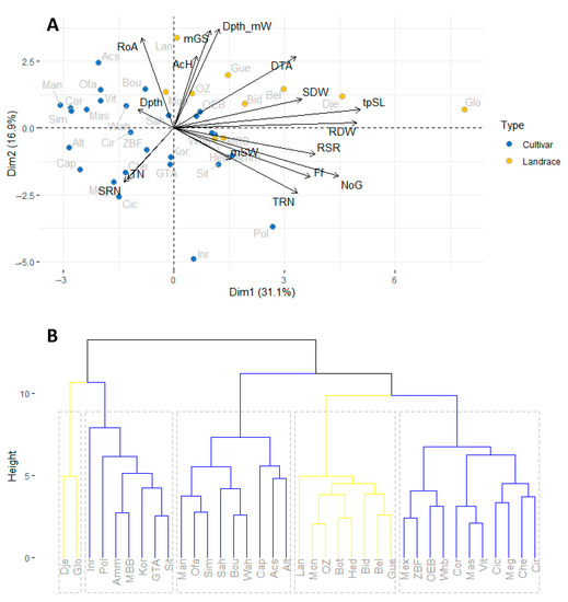 Biplot of the principal component (A) and hierarchical analysis (B) of shoot and root traits recorded in the field (shovelomics) experiment. Abbreviation of genotype’s names and their type and origin are given in Table S1. Type groups according to the cluster analysis, are color coded similarly in A and B (cultivars in blue and landraces in yellow).