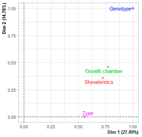 Multiple factorial analysis (MFA). The plot represents the correlation between groups of variables and axes. Growth chamber (green), and shovelomics experiment (red) are active groups based on quantitative variables used to define the dimensions of the MFA. Genotype and Type are supplementary groups based on categorical variables specifying the genotype identity and the type of germplasm (landraces vs. modern cultivars). Triangles represent the correlation of groups with the axes.