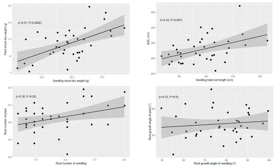 Relationships between similar traits measured at seedling and adult plant stages (shovelomics); tpSL, total projected structure length. The 95% confidence interval is indicated in grey. Correlations calculated based on 37 genotypes in common between the two experiments, growth chamber and shovelomics.