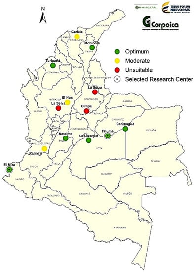Apart from the studies described above the national agricultural research system, AGROSAVIA (a.k.a Corpoica) conducted a preliminary review of Robusta coffee and reported the crop as: “a promising option to intensify and diversify production systems in the tropical lowlands of Colombia”. The same entity carried out a third complementary study [] that made it possible to determine, the Corporation’s research centers in the country that could provide support for the first evaluations of Robusta coffee genetic based on the variables of altitude, temperature (maximum and minimum) and radiation (Table 4). A map of these centers’ locations is shown in Figure 1.