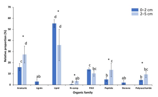 Relative proportion of the main organic families in which organic compounds released during analytical pyrolysis are ordered. The different letters in each sample indicate the existence of significant differences among organic families (“one-way ANOVA”; means compared to the Tukey test, p = 0.05). Specific families with * are significantly different between depths (“one-way ANOVA”; it means compared to the Tukey test, p = 0.05).