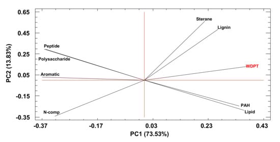 Plot of component weights for the soil water repellency variable (WDPT) and the main organic families identified by analytical pyrolysis: aromatic, polysaccharides, peptides, lignin, lipids, nitrogen compounds (N-comp), polycyclic aromatic hydrocarbons (PAH), and steranes.