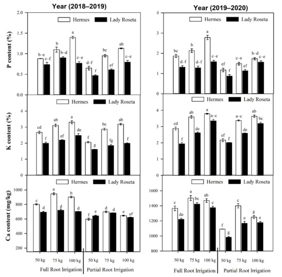 In our experiment, a significant decline in nutrient (P, K, Ca) accumulation was detected due to water insufficiency. However, exogenous potassium (K) supplementation improved nutrient uptake and transport in both irrigation zones, but markedly favored FRI as compared to PRI (Figure 1 and Figure 2). These attributes were maximum with a potassium application of 100 kg·ha−1, except for calcium, when they were maximum at 75 kg·ha−1 application. Moreover, Hermes accumulated more nutrients compared to Lady Rosetta.