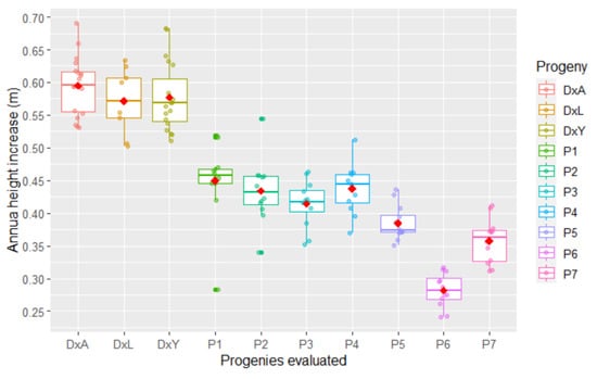 Annual height increment of seven dura × dura progenies and three commercial tenera cultivars. The red point corresponds to the general average of the progenies or cultivars and the horizontal line to the median. DxA: Deli × AVROS, DxL: Deli × La Mé, DxY: Deli × Yangambi, and P1 to P7: dura × dura dwarf progenies.