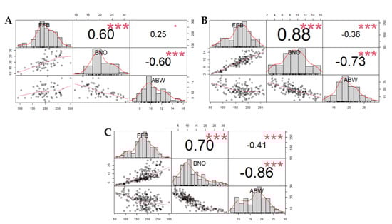 Pearson correlations for yield traits in dura × dura progenies. (A): Young stage. (B): Adult stage and (C): All crop cycle. FFB: Fresh Fruit Bunches, BN: Bunch Number, and BW: Average bunch weight. *** Highly significant correlations (p ≤ 0.01).