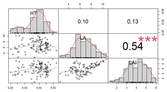 For the main vegetative traits of interest, the Pearson correlation coefficients showed correlation values of (r = 0.10, p ≤ 0.01) between HT and LA, and a low association between HT and LAI with 0.13 (p ≤ 0.01). In contrast, a significant correlation between LA and LAI with r = 0.54, p ≤ 0.01 was achieved (Figure 3). Thus, the knowledge of the association of the different genetic traits in oil palm is fundamental for the selection of progenies with direct genetic gains [].