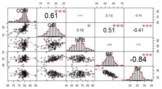 Pearson correlations for bunch quality traits in Dura × Dura progenies. Where: ODM: Oil to dry mesocarp ratio (%), O/B: oil to bunch ratio (%), NF/B: normal fruit to bunch ratio (%), M/F: Mesocarp-to-fruit ratio (%), S/F: Shell-to-fruit ratio (%). * Significant correlations (p ≤ 0.05). *** Highly significant correlations (p ≤ 0.01).