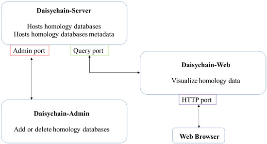 Daisychain consists of three modules: Daisychain-Server, Daisychain-Admin and Daisychain-Web (Figure 1). All modules are written in Python 3.5. Daisychain-Server hosts the server routines and all data. Daisychain-Admin is used to administrate the server from the local computer or remotely, while Daisychain-Web provides the web service used for database querying and data visualisation. Daisychain can host multiple independent homology databases, with data and metadata stored in Neo4j graph databases. The web application is built upon KnetMaps.js [32], (https://github.com/Rothamsted/knetmaps.js (accessed on 21 August 2021)) which uses cytoscape.JS 2.4.0 [33] and jQuery 1.11.2 (https://jquery.com/ (accessed on 21 August 2021)). Data is represented in graph format, with genes or proteins as nodes and homology and gene neighbourhood relations as edges. Queries are submitted in plain text format to the server application, and graph data is returned in JSON format. The server application employs Neo4j’s Cypher query language to search for genes by ID. Genes can also be found by sequence search using a local BLAST [34] database. Gene nodes can be found by sequence search. Daisychain supports single nucleotide sequences as query as well as multi FASTA formatted sequences. Any special characters are removed from individual nucleotide sequences. The server application detects whether the sequence is nucleotide or protein based on the contained characters. Nucleotide or protein sequences are compared with the database using BLAST. This returns a list of gene or protein IDs, which are then displayed in graph format. Genes or protein nodes are retrieved from the homology database using Neo4Js Cypher query language.