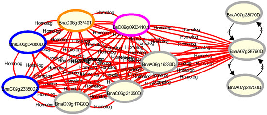 Visualisation of gene homologies with Daisychain-Web for the disease resistance gene Rlm1 candidate gene BnaA07g28760D [36], its 3′ and 5′ neighbors and other homologs in the B. napus v4.1 annotation [12] (grey circles), compared with the B. napus ZS11 annotation [16] (pink circle), the B. napus Tapidor annotation (orange circles) and the Darmor-bzh v8.1 annotation (blue circles) [14]. The B. napus v4.1 annotation contains 3 homologs for the candidate gene, while the ZS11 and Tapidor annotations both contain only one homolog. Gene homologs are connected by undirected edges. The colour of the edge represents the sequence identity between the two connected genes. Gene neighbours are connected via differently styled edges, while gene nodes are coloured by their assembly. Clicking a node or an edge adds a tooltip to the visualisation with information about the assembly and contig the gene is located on. More information is shown in a layover menu when the “Show Info” option in the context menu is selected (not shown).